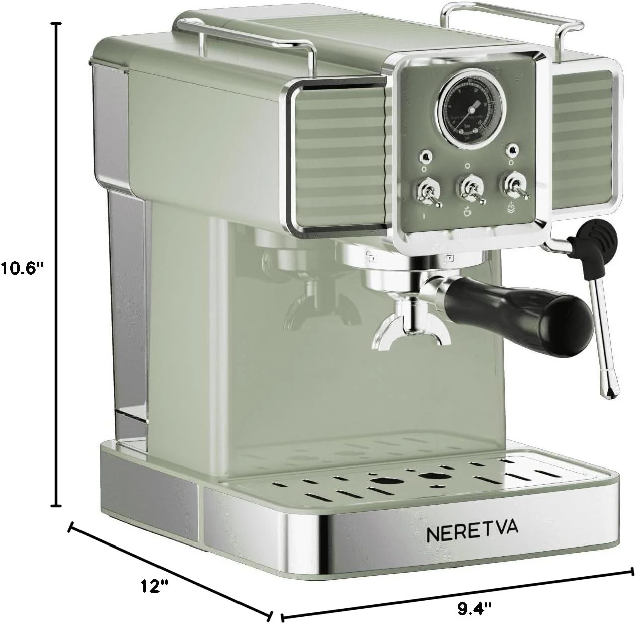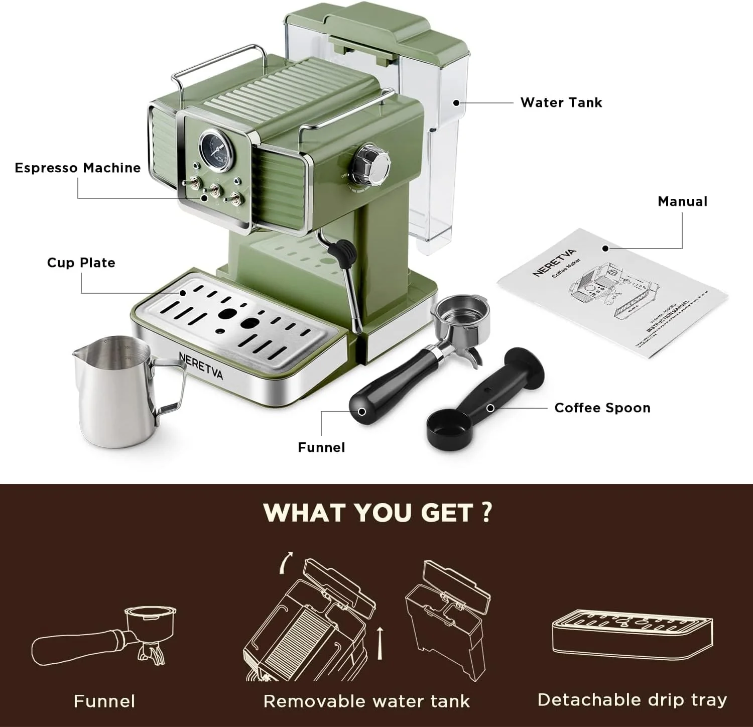 Neretva Espresso Coffee Machine 15 Bar Espresso Maker with Milk Frother Steam Wand Cappuccino, Latte for Home Barista, 1.6L Removable Water Tank