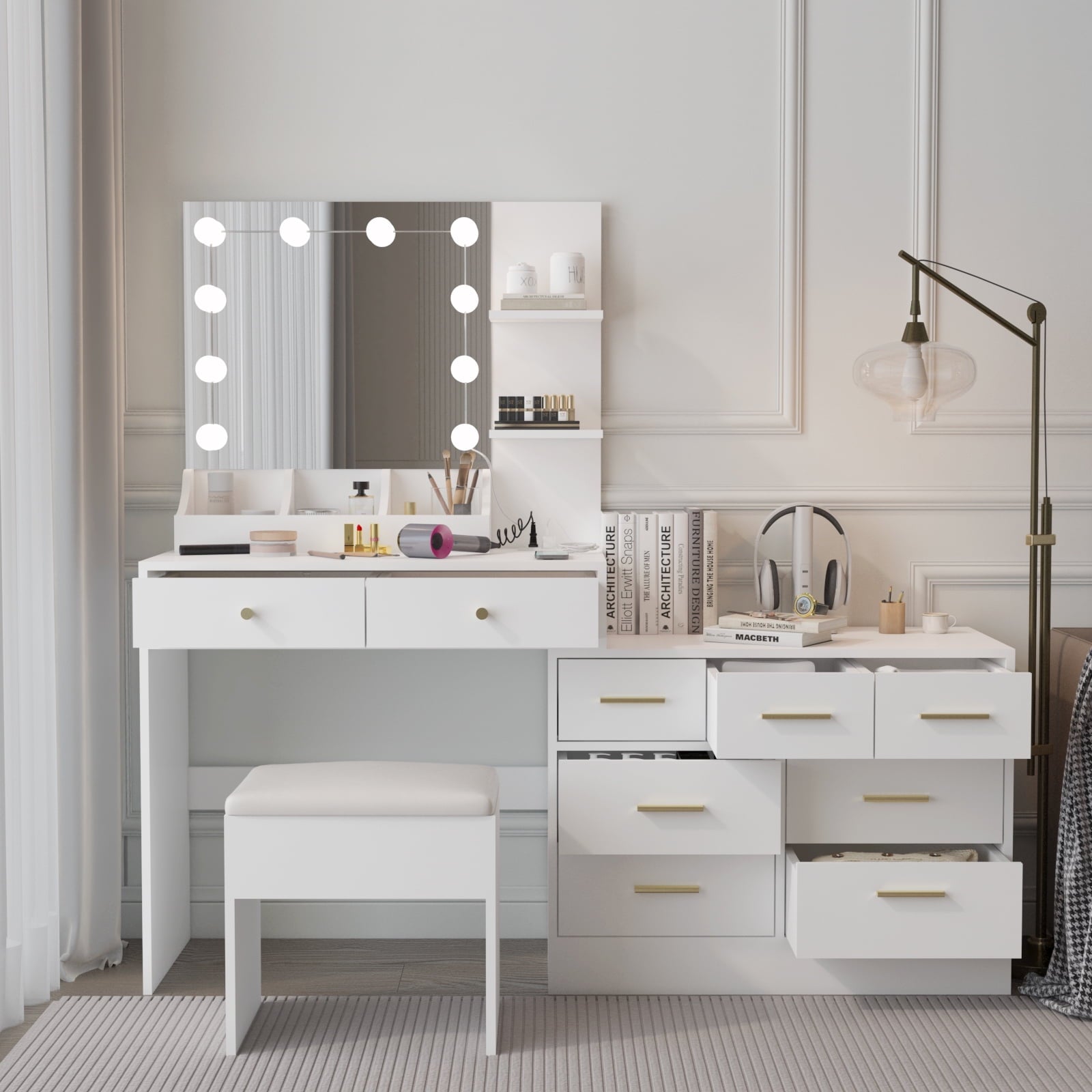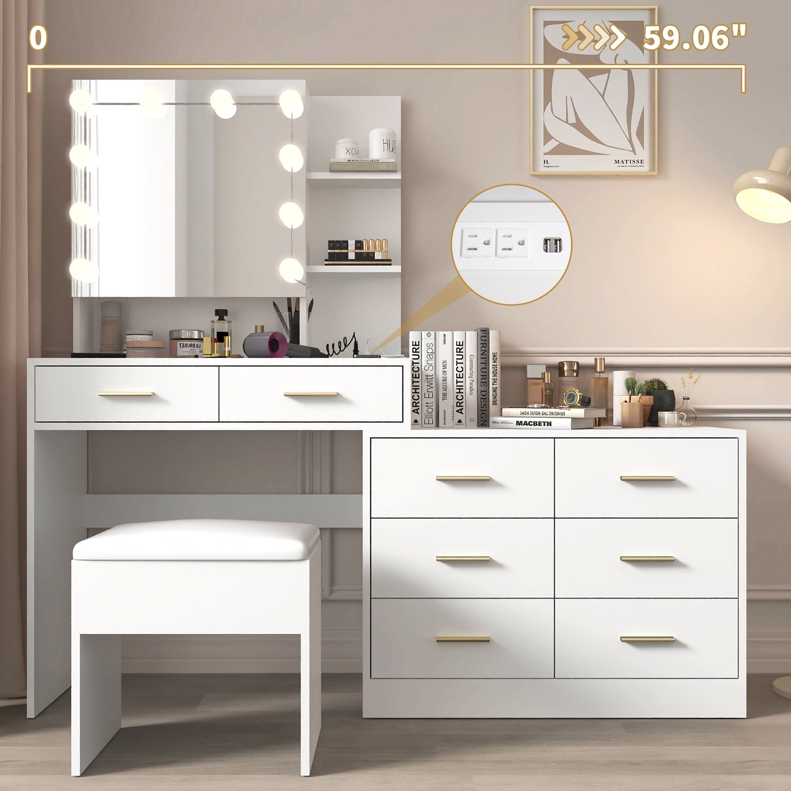 Ktaxon Makeup Vanity with 9 Drawers&USB Charging Station, Vanity Desk with 3 Color Light, Vanity Table Set w/ 9 Drawer Dresser, for Girls and Women, White